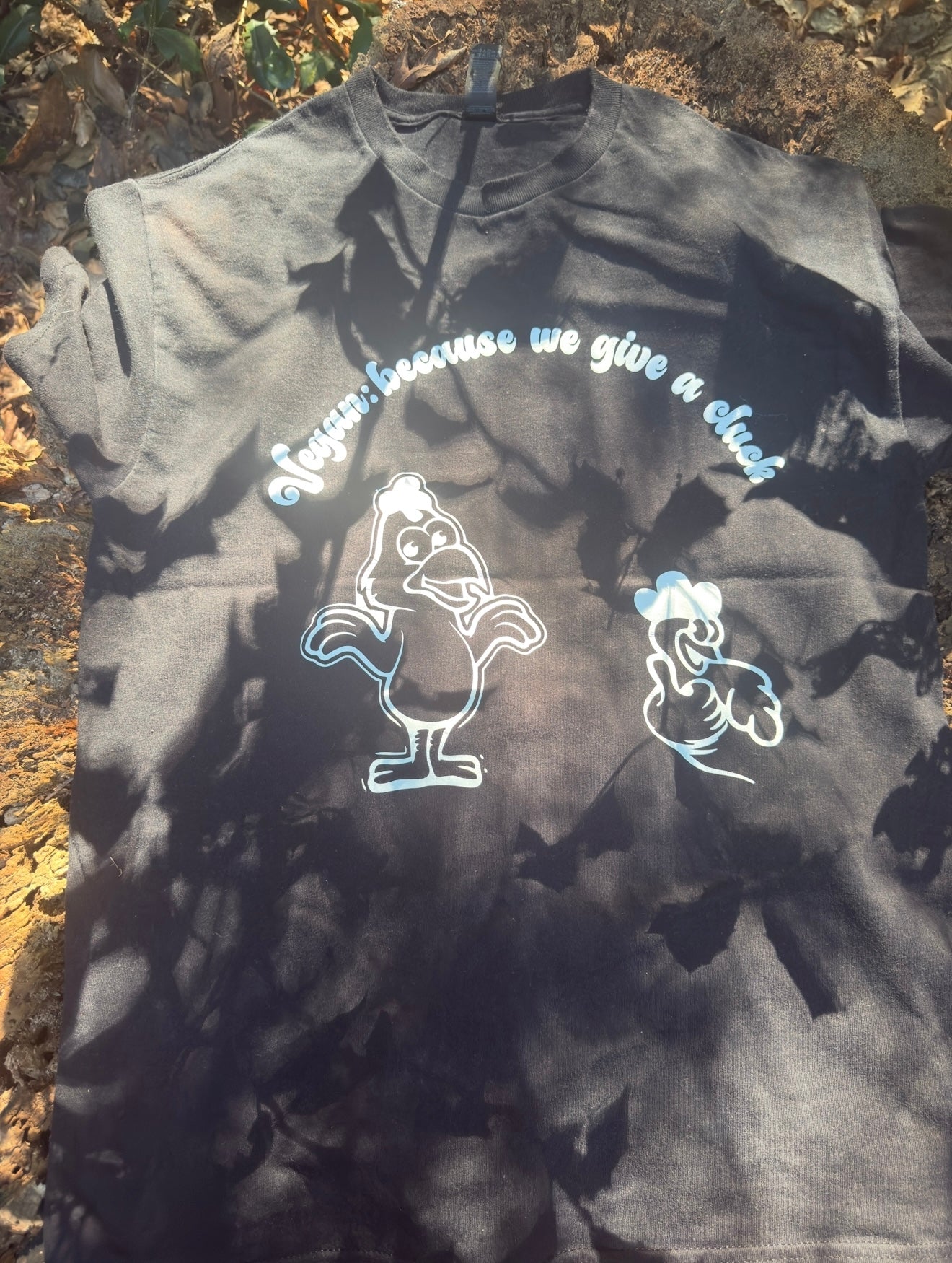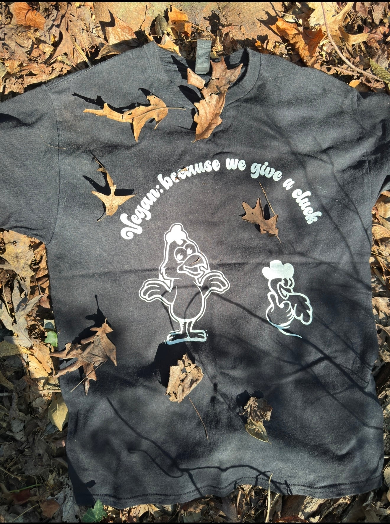 Show the world your compassion with a smile in our Vegan Because We Give a Cluck T-shirt. Featuring a cheerful chicken giving a shrug and a smaller chick with a thumbs-up, this design is perfect for spreading vegan vibes in a lighthearted way.